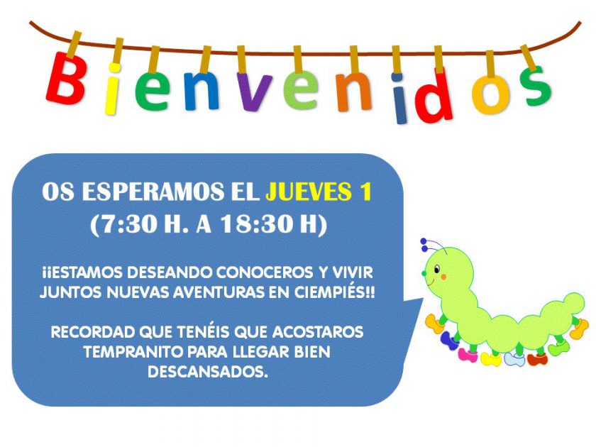Os esperamos el JUEVES 1 desde las 7:30h hasta las 18:30h ¡¡Estamos deseando conoceros y vivir juntos nuevas aventuras en Ciempiés!! Recordad que tenéis que acostaros tempranito para llegar bien descansados.